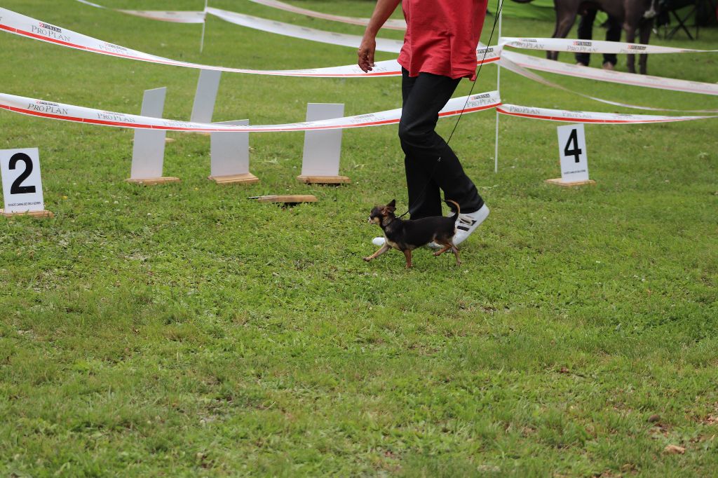15 mois ff b crame yeux bonforme b enconleur narine b ouverte museau pourrait etre rempli oreille correcte exc denture très difficile à juger parce qu'il se présente pas angulation les pieds pourraient etre plus serrées port de fouet intermittants